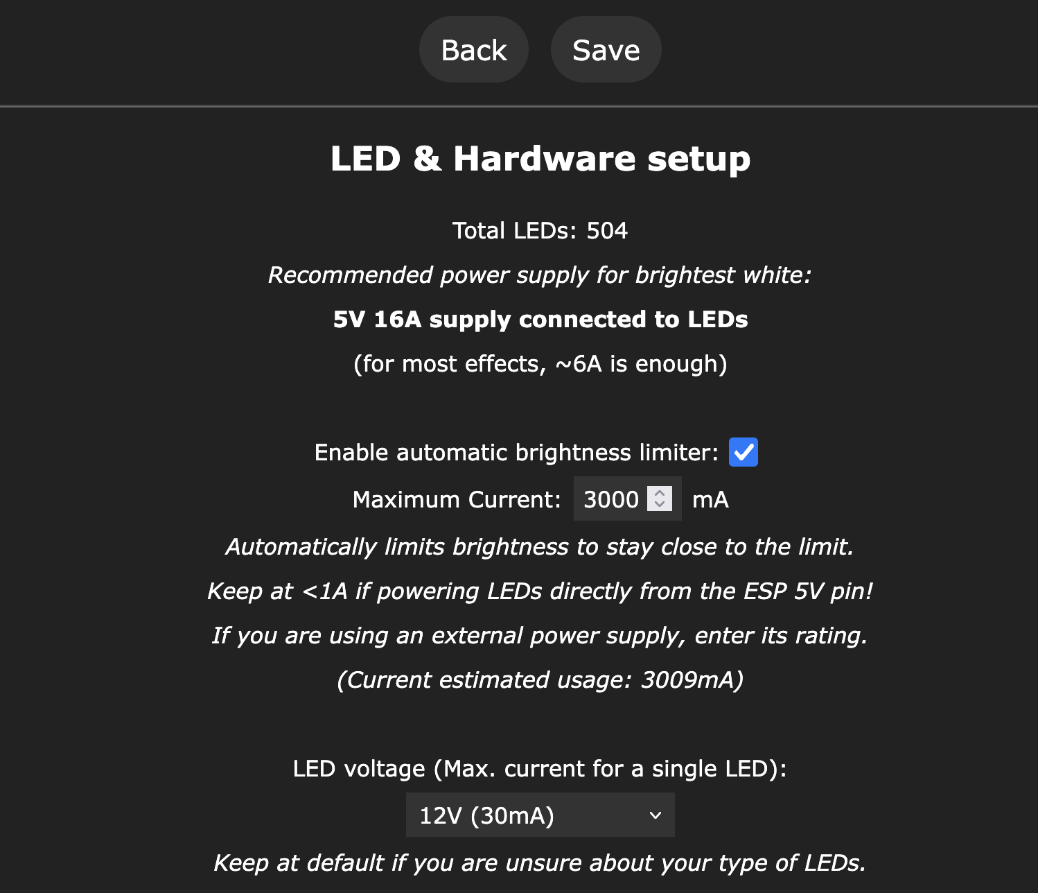 I’m honestly surprised Brickstuff doesn’t turn this on by default - and perhaps set it to 35 mA per LED for a bit of headroom - because this is very handy tool for extra safety. The relay on the tower prevents you from drawing too much current and resets the tower when doing so - but it’s always nice to avoid it. Anyway, enabling this does let you eek out a bit more brightness on the tower if you’re okay with bumping right up against the current limit. The 3009 mA figure is from a tower setting that tries to glow the tower as close to real life as possible.